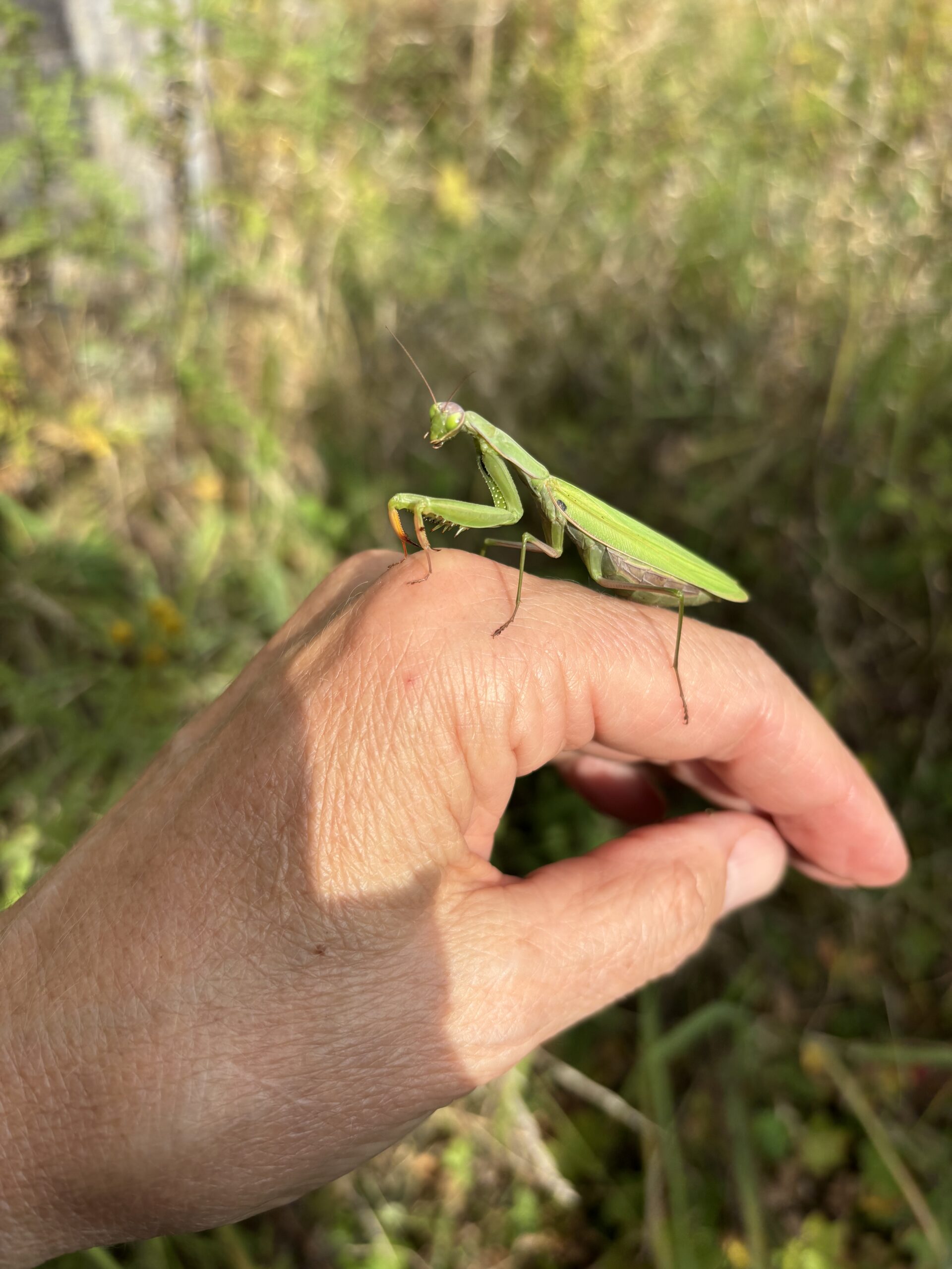 Neben Ackerhummel, verschiedenen Wildbienen, Marienkäfer und Gammaeule (einer der bekanntesten Nachtfalter), war zweifelsohne eine imposante Europäische Gottesanbeterin (Mantis religiosa), die sich, erkennbar an dem prallen Hinterleib, kurz vor der Eiablage befand. Nach der Paarung wird das Männchen vom Weibchen gefressen. Einige Tage nach der Begattung werden 200 bis 300 Eier gelegt – das Weibchen stirbt kurz danach –, die durch eine schnell härtende, schaumige Eiweißmasse geschützt werden, die Bauschaum ähnelt, so der Biologe. Hierin überwintern, ausgezeichnet isoliert, die Embryonen, um dann im Mai bzw. Juni des Folgejahres zu schlüpfen und sich mindestens fünfmal häuten müssen, bis sie das Erwachsenenstadium erreichen und sich wiederum paaren können.